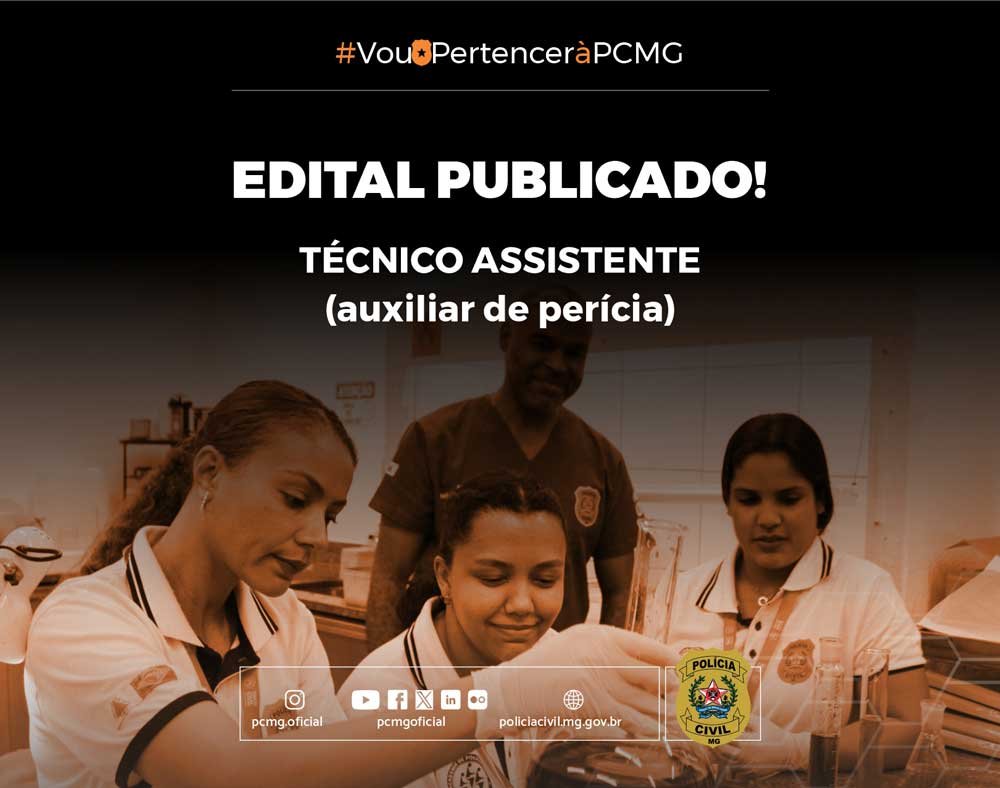A Polícia Civil de Minas Gerais (PCMG) publicou, nesta sexta-feira (7/11), o edital de abertura do concurso público para provimento de 104 vagas imediatas destinadas à carreira de técnico assistente.