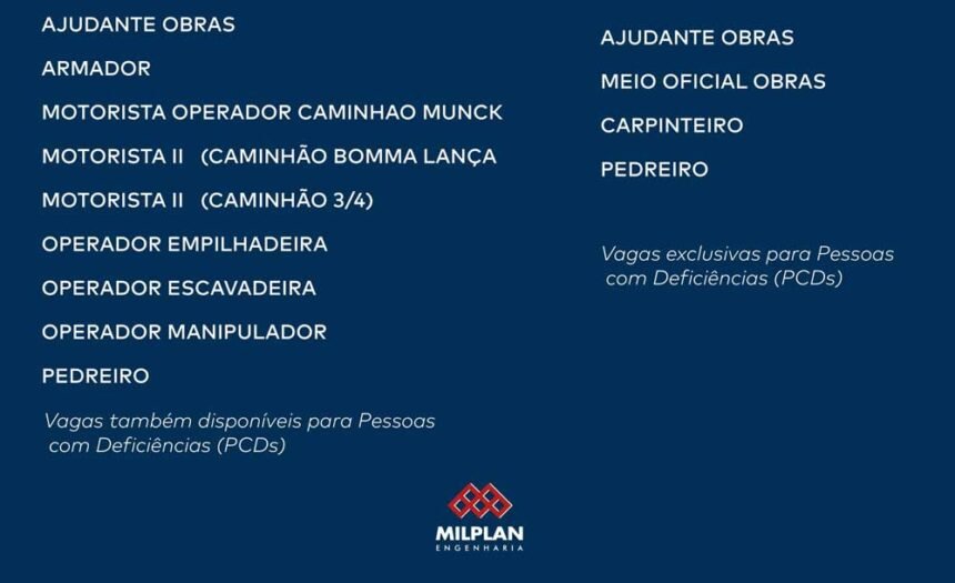 A Milplan Engenharia divulgou novas oportunidades de emprego para atuação nos municípios de Tapira (MG) e Santo Antônio dos Lopes (MA). As vagas abrangem diferentes áreas da construção e operação industrial, ampliando as chances para profissionais com experiência em obras, operação de máquinas e atividades técnicas.