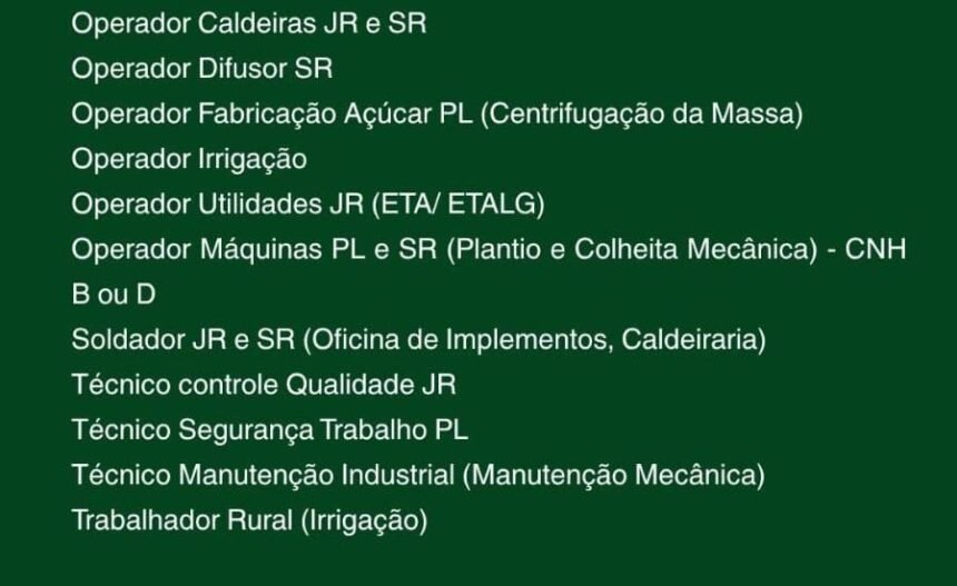 A Cargill Bioenergia anunciou novas oportunidades de emprego para a unidade São Francisco, com vagas disponíveis também para Pessoas com Deficiência (PCDs). As posições divulgadas são exclusivamente externas e abrangem diferentes áreas operacionais, técnicas e de manutenção. Os interessados devem enviar currículo para curriculos@cargillbioenergia.com, informando no assunto do e-mail o nome da vaga pretendida.